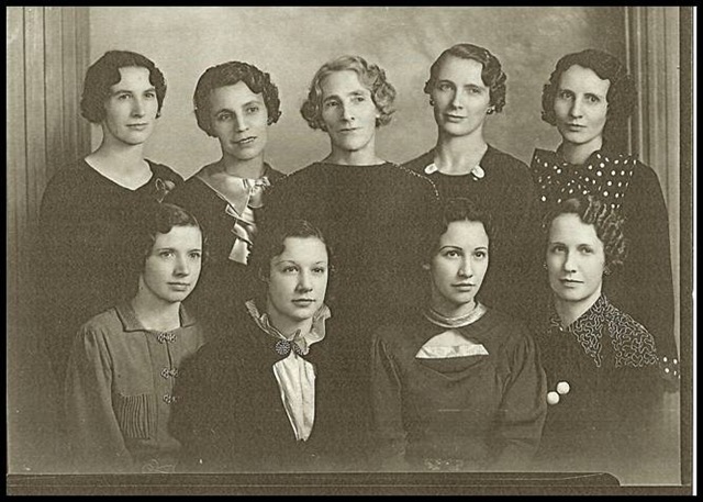 Annie Thurgood Holt and her daughters. Top Row: (L-R) Emerald, LaVon, Annie, Genevieve, Bessie. Bottom Row: (L-R) Erma, Cleone, Bernice, Louise. (Dec 20, 1935)