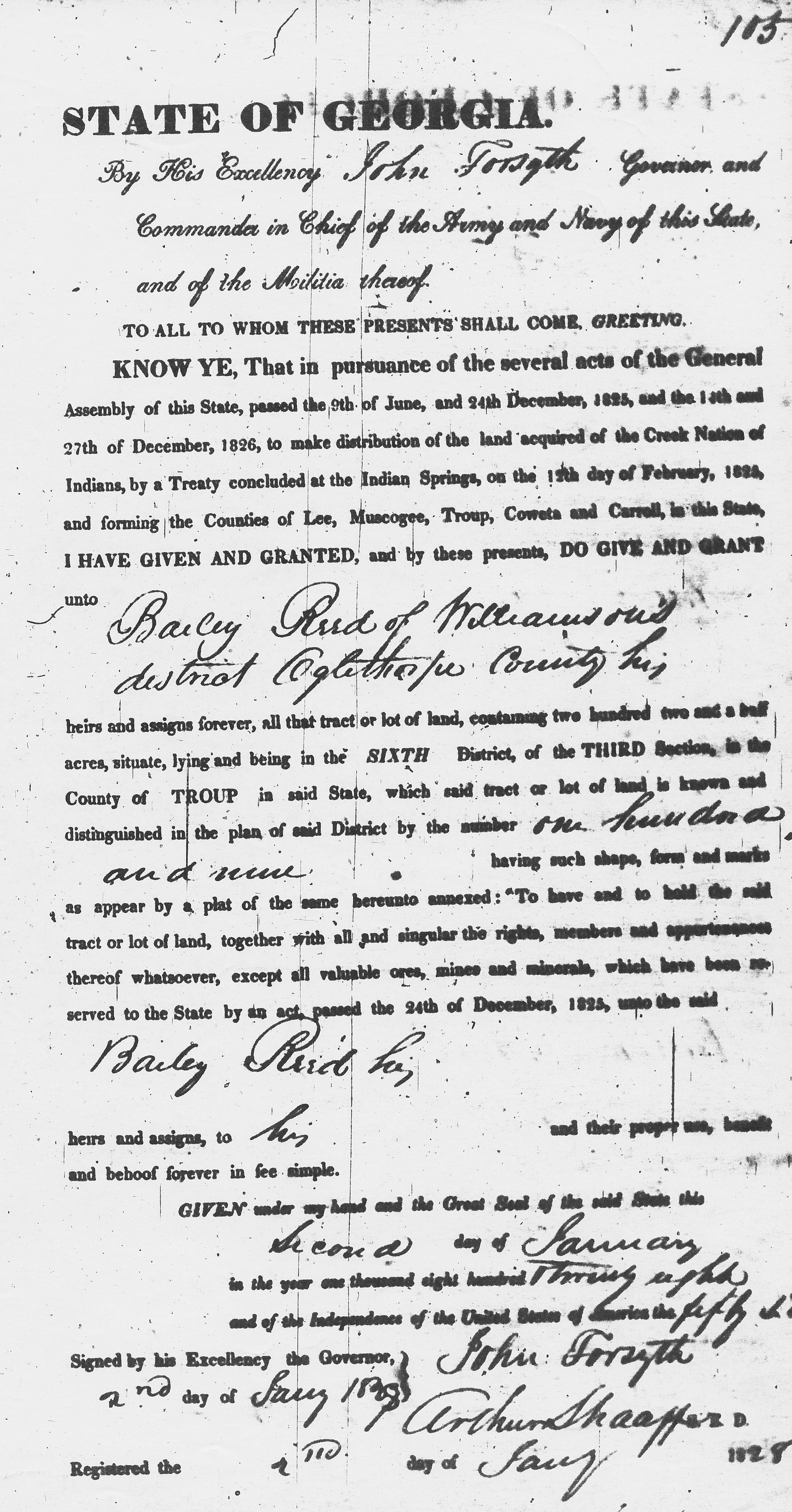 For Bailey, being a fortunate drawer of land in this lottery must have been like striking gold. His draw was for land lot 109, a 202.2 acre parcel of land ceded by the Creek Indians in what is now known as Troup County, some 150 miles southwest of Oglethorpe County. The following excerpt from Troup County, Georgia History offers insight as to the disposition and unique history of the land lot that Bailey drew: