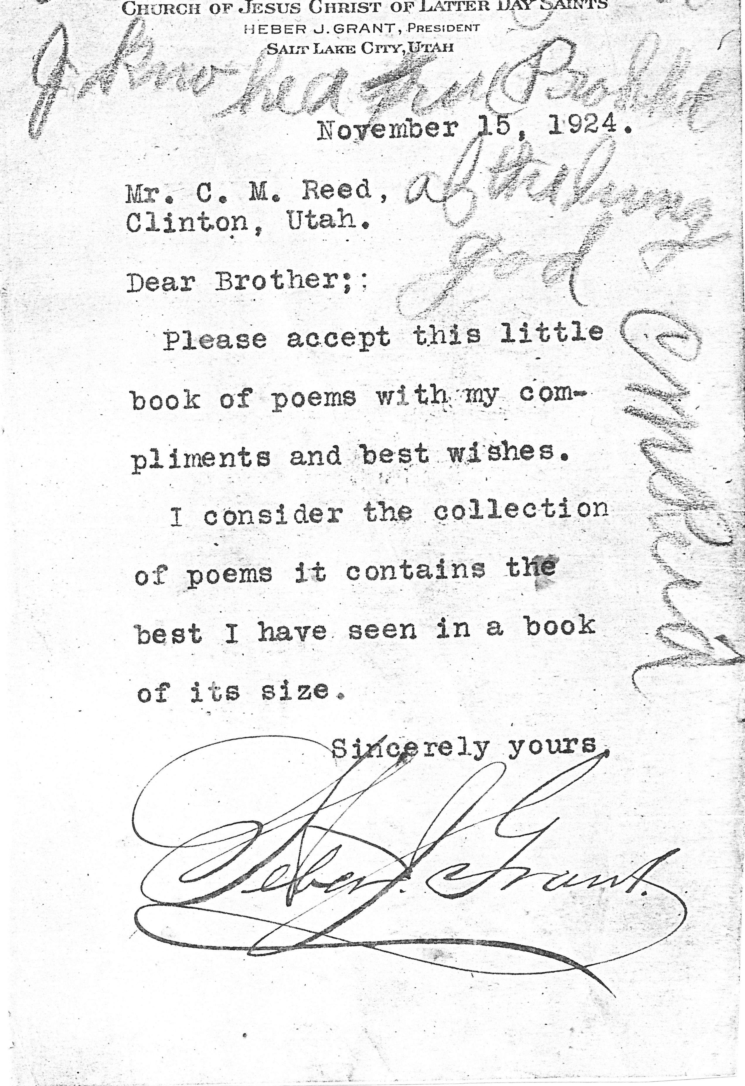 The young mother was also promised, “Thy table shall be spread with the best fruits of the land.” This promise was literally fulfilled, for the apples, peaches, and cherries that Charlie raised in his orchard were acclaimed throughout the area; the year Charlie entered them in the State fair, they won first place. That year, Charlie gave President Heber J. Grant a couple of bushels of apples, and received a book of poetry in return, a banker from Ogden who bought fruit from him would take a friend from back East to the Reid orchard to eat the tasty fruit Charlie produced.