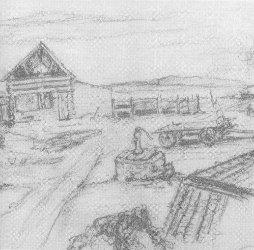 Charcoal Drawing of Charles Morgan Reid Residence in Clinton, Utah by Junior Davis. This view from the roof top of the Clinton home looks west toward Antelope Island in the background.
