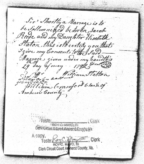 It was while working in Amherst County that Jacob met Elizabeth (Mary) Staton. They were married soon after on 30 May 1792. Since Mary was under the age of 21, her father, William Staton, was required by law to provide written consent to the marriage. John Reede and James Callaway were witnesses to the marriage consent.