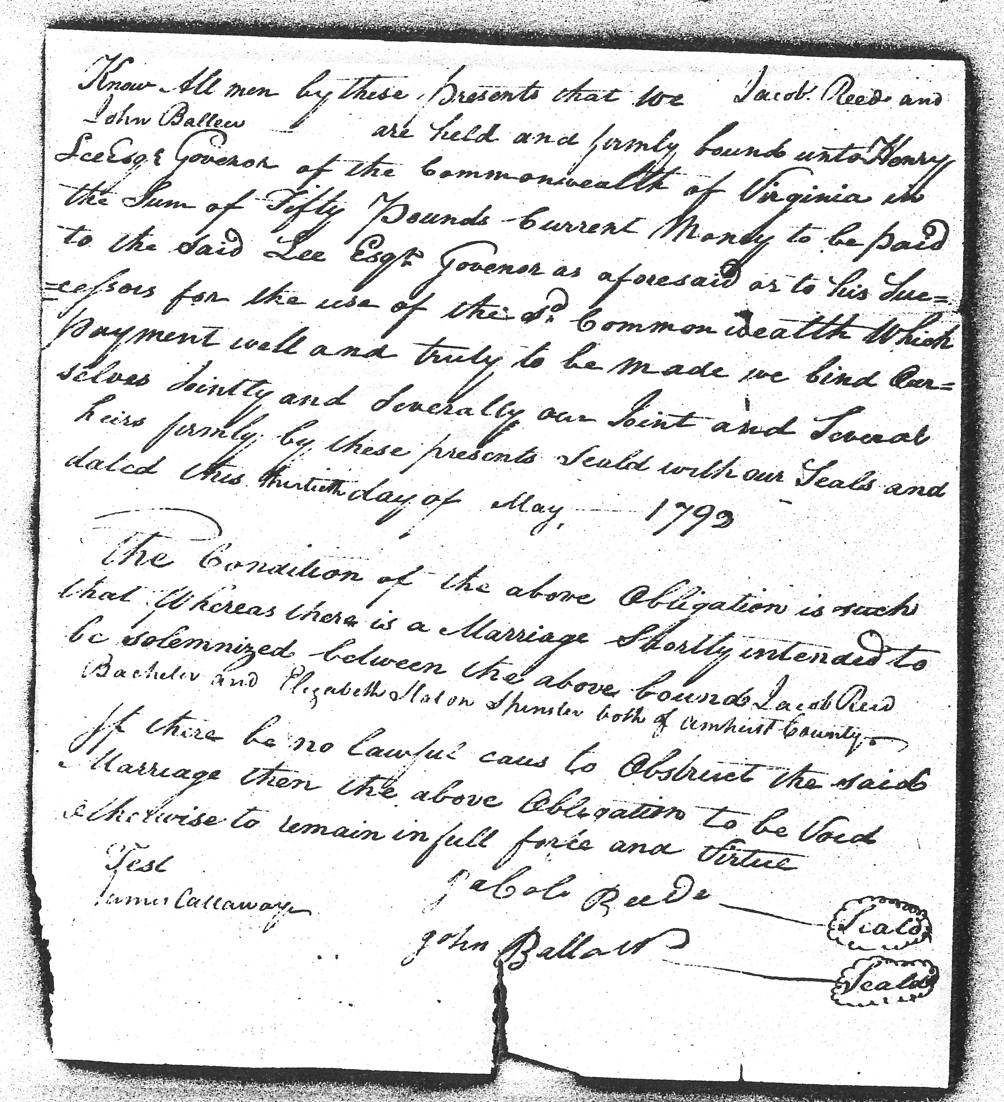 Neighbor John Ballow co-signed the marriage surety bond, to which both he and Jacob were obligated.