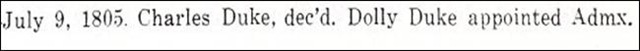 1805 – Charles Duke died and his wife, Dorothy or Dolly, is administratrix.