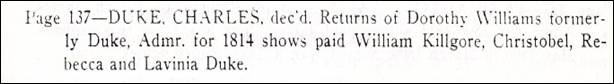 1814 – Dorothy (Dolly) remarried a Mr. Williams and settled estate of Charles Duke.